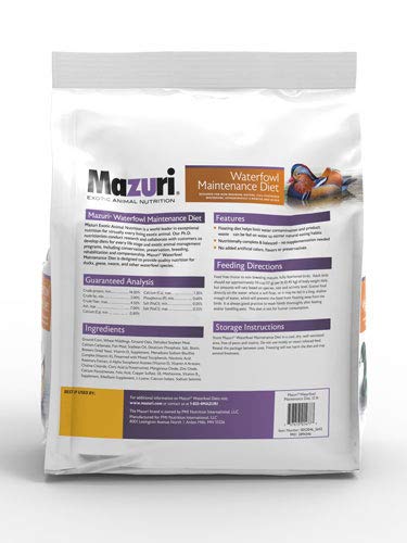 Mazuri waterfowl starter diet. Containing fishmeal, this floating diving duck food allows for feeding of birds in the water and prevents accumulation on the bottom of the feeding area to limit contamination and waste. Mazuri® waterfowl maintenance diet is designed to provide quality nutrition for ornamental ducks, geese, swans and other waterfowl species. High protein, high nutrient density diet.
